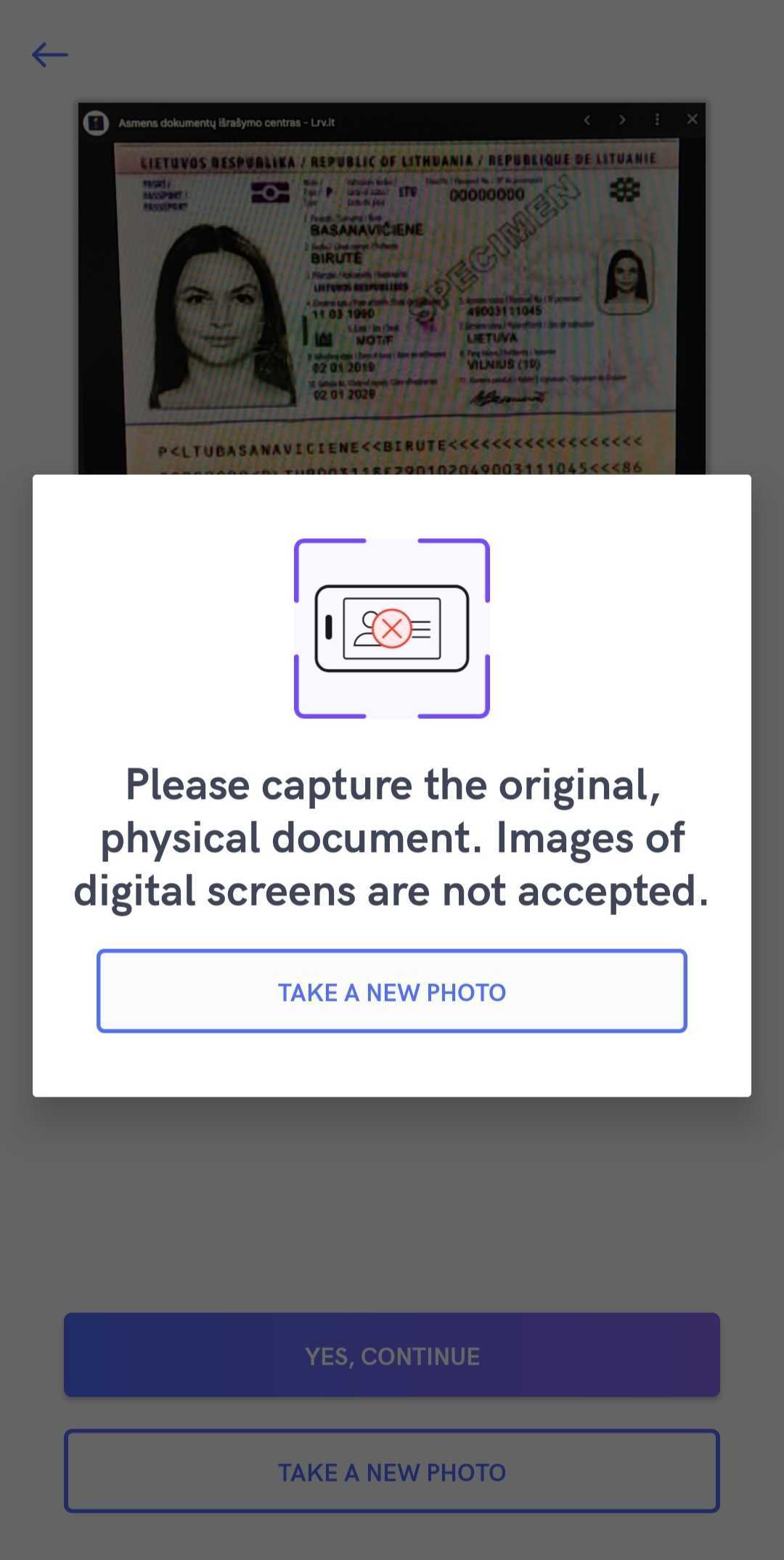 If your account has enabled passive liveness check, the SDK will include liveness check to photo validation, an unsuccessful result will be shown immediately after each step.